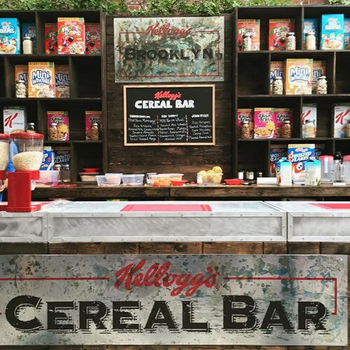 Kellogg’s vision was to have a rustic cereal bar, where patrons could experience ‘cereal cocktails’ created by local rising chefs; for instance a bowl of Corn Flakes with shaved ginger, mango slices, chocolate chips, and coconut milk. Each city featured three unique ‘cereal cocktails’. The cereal bar utilized our Custom Built Rustic Bar with Metal Riveted Tops and Rustic Wood Back Bar, and our Pipe Leg Table Dining Area with Gun Metal Stools.